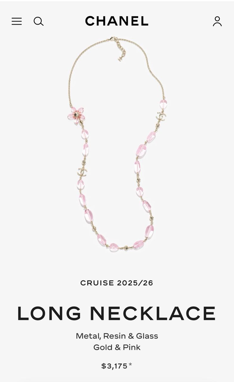 Elevate your style with this stunning long necklace from the Chanel Cruise 2025/26 collection. Crafted with exquisite attention to detail, this piece features a beautiful combination of metal, resin, and glass in an elegant gold and pink color palette.